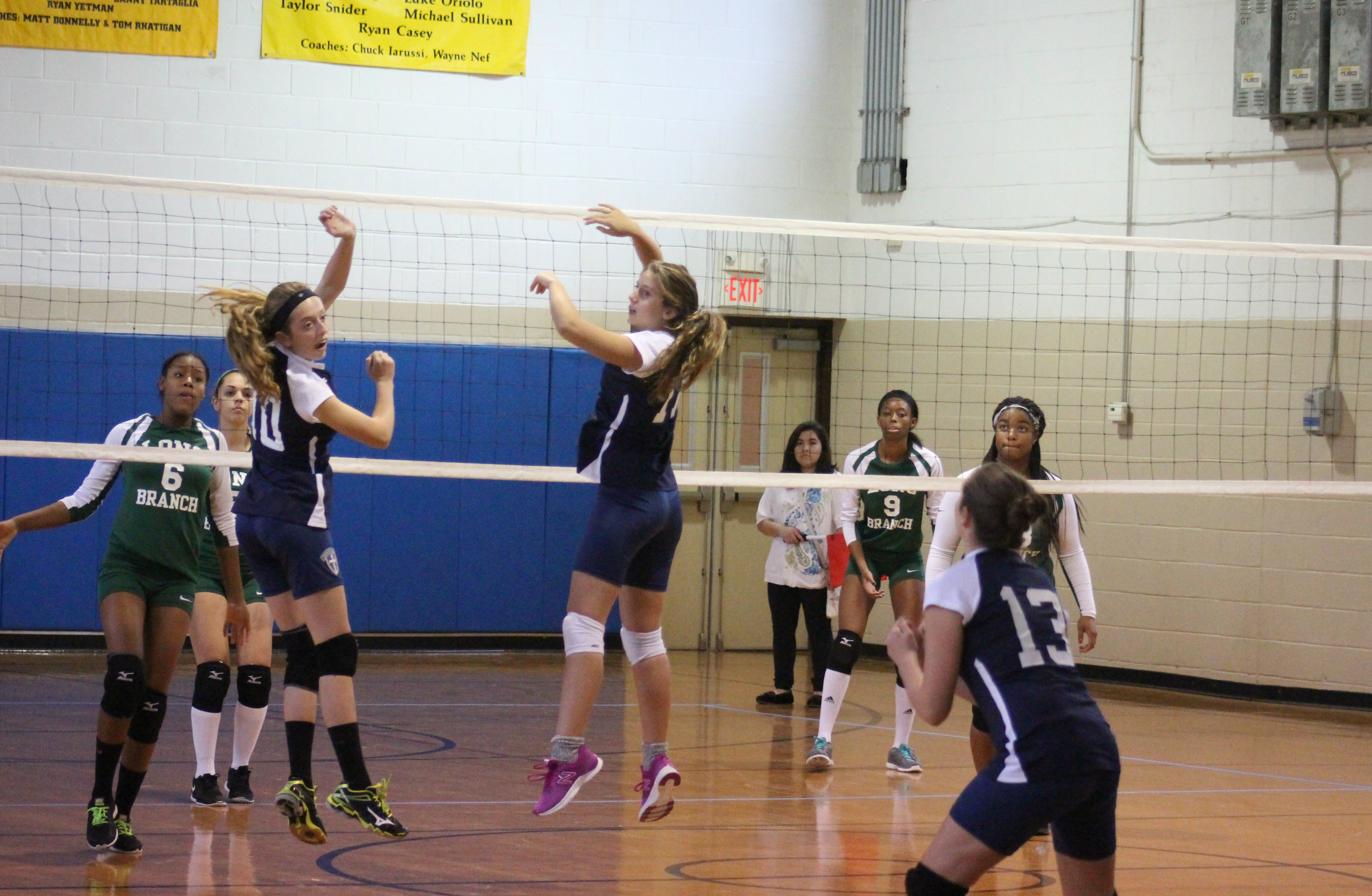 Jackie F. and Sarah F. look to teammate Hailey H. for a dig in their game against Long Branch High School on Oct. 15.