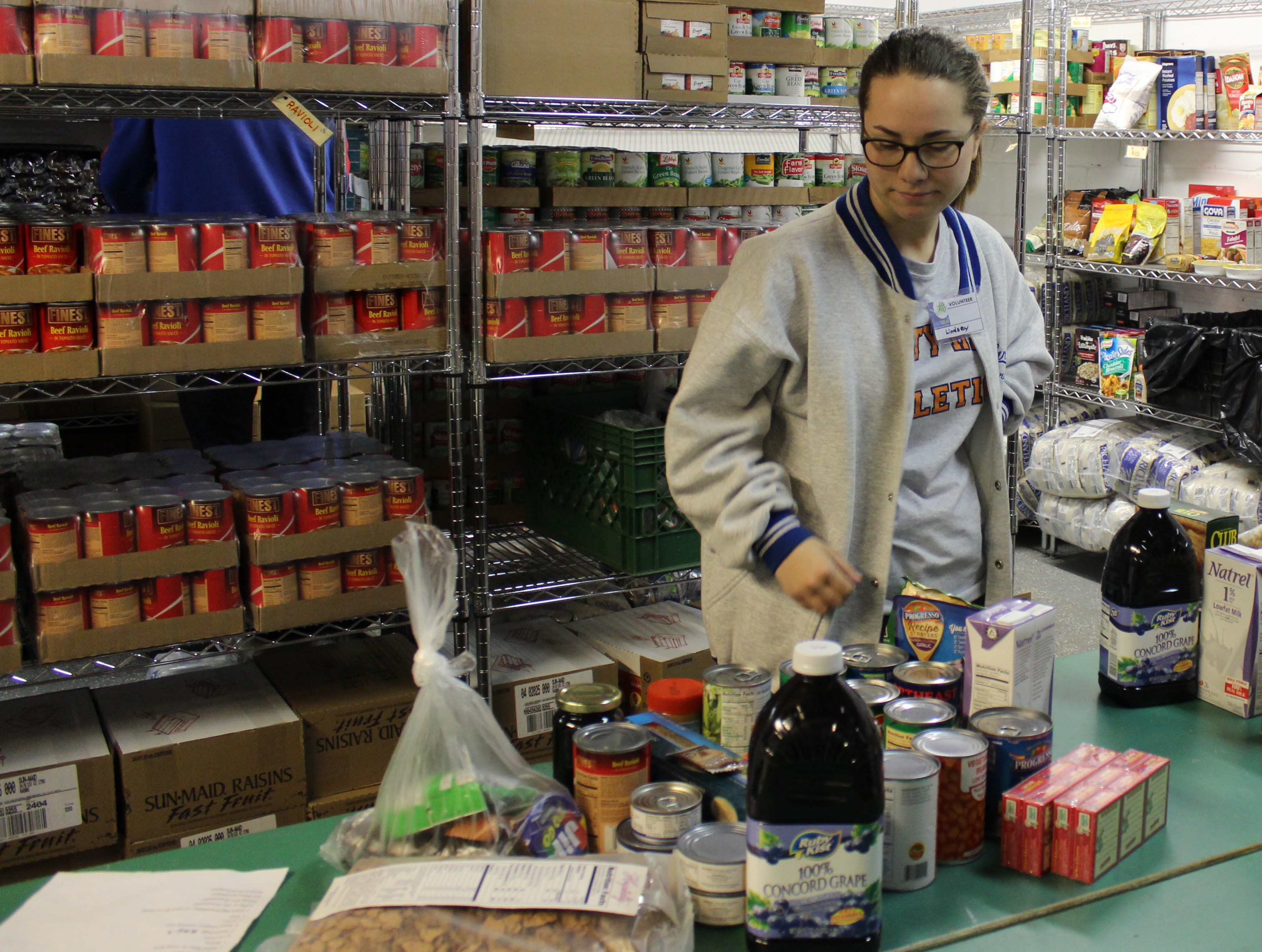 Freshman Lindsey Bischoff organizes food to be donated at Lunch Break in Red Bank on Service Day.