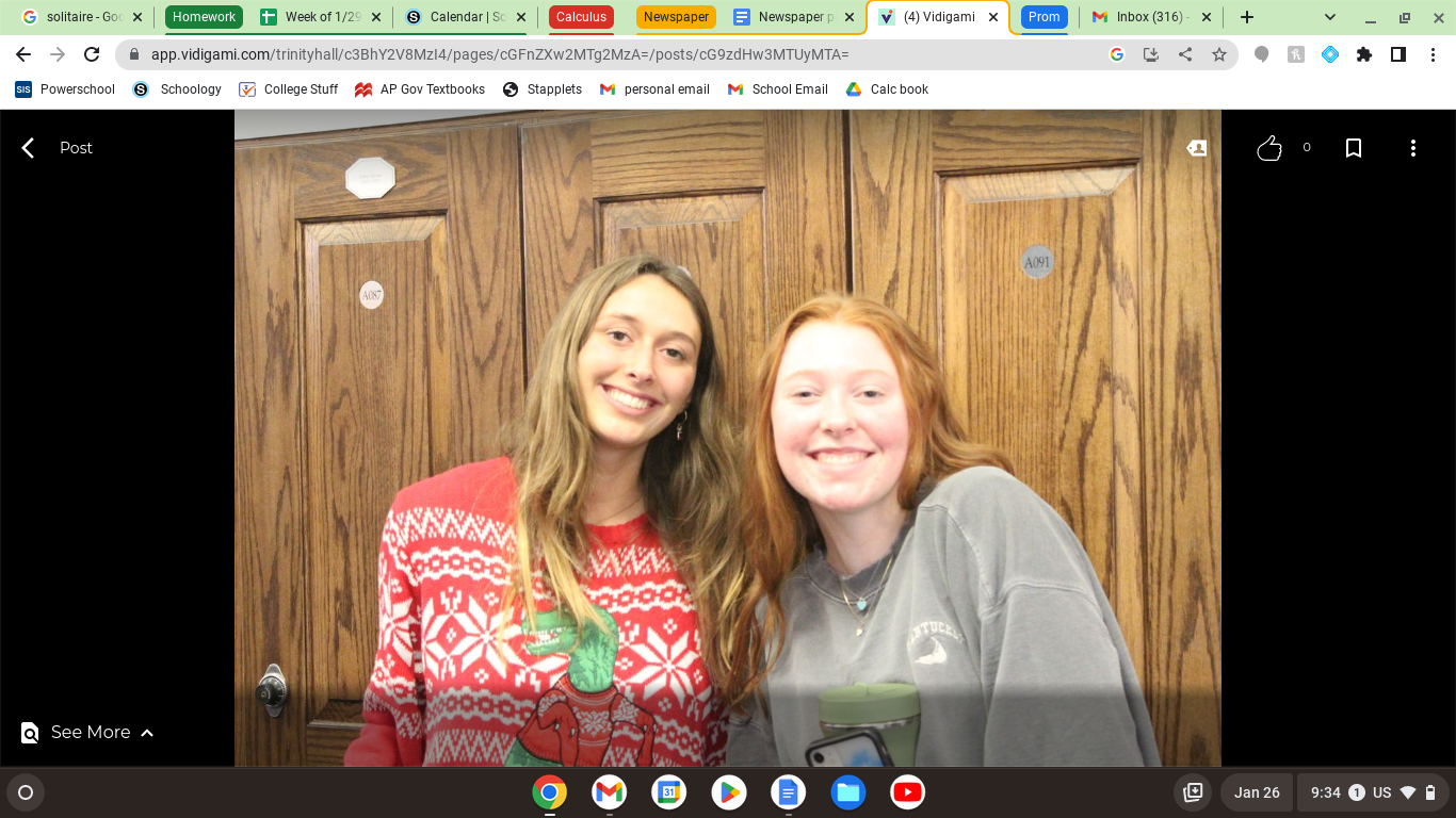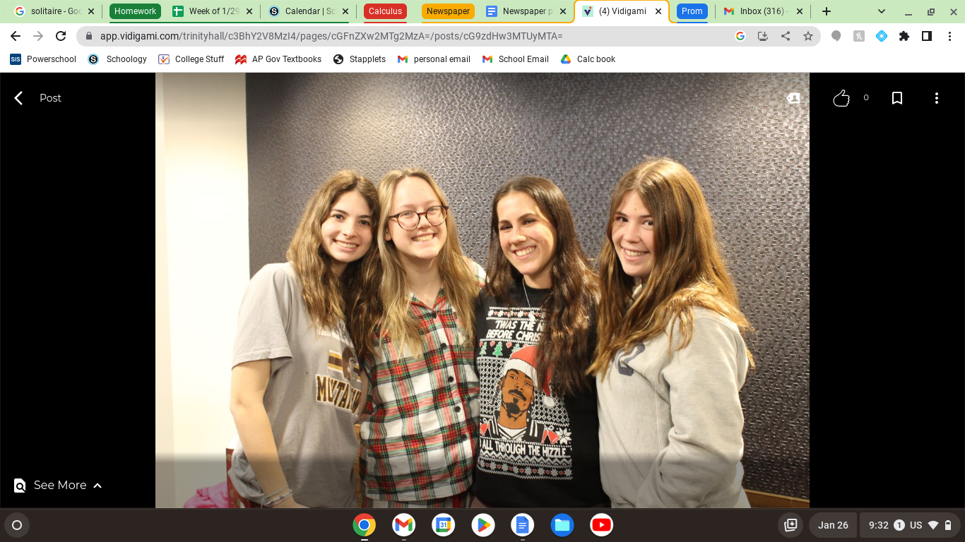 One of the most anticipated traditions of the school year is the “Trinity Elves” gift exchange. Before Thanksgiving Break, “Trinity Elves” commenced as students were randomly assigned the name of a fellow classmate. In true Secret Santa fashion, students acted as “elves,” exchanging presents with one another while keeping their identities a secret. Over the course of two weeks, students exchanged two small gifts, setting the stage for the final large gift and revelation of the secret “elf” identities, which took place on Friday, December 16.