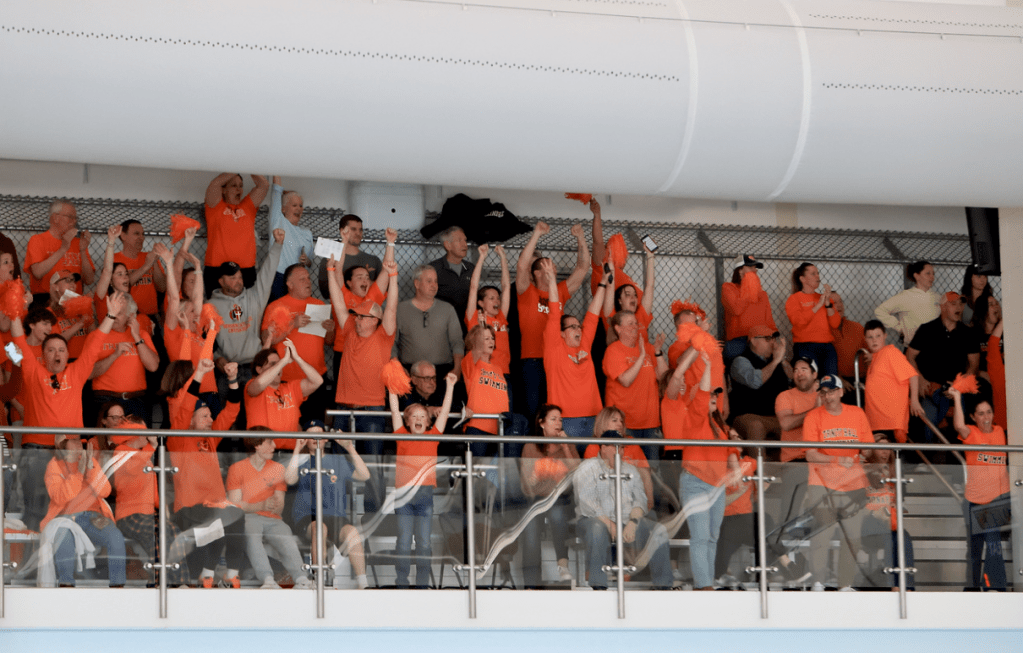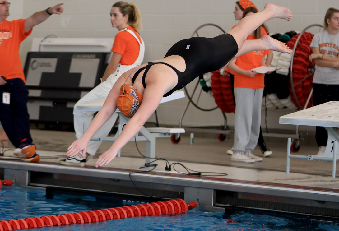 Following this triumphant win, the Monarchs swim team felt it was time to celebrate and commemorate all the impressive accomplishments, hard work and dedication of the senior swimmers. The annual intersquad Orange and Blue Meet took place on February 6. Each senior was celebrated by a junior giving a personal speech to each of them, along with a bouquet of flowers and a poster. After the heartfelt messages, each team put their game faces on and the meet commenced. The energy at the meet was electric with every single swimmer cheering for their respective team.