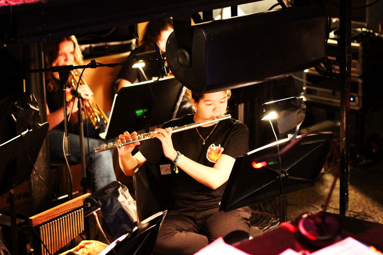 Following the fall production, the spring musical “Firebringer” was underway. The Queen’s Court Company and Crowning Crew prepped for another comedy, this time with musical numbers and major choreography. The show required a prehistoric set in a cave and forest with big, fuzzy animals and fake fire made to look real. The Crowning Crew rose to the challenge, making giant, moving puppets and fire that made the stage glow. With the close of “Firebringer,” the Queen’s Court Company as a whole celebrated another year with two successful shows to remember.